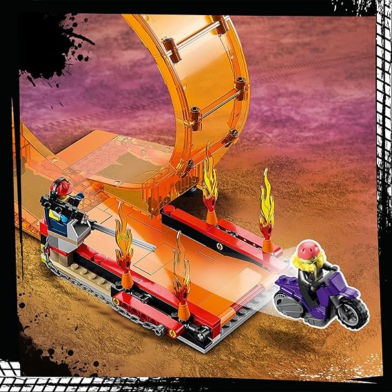 内容。入場アーチ、ヘビのループ、火の輪、炎の壁、モンスタートラック、売店、観客席、スタントバイク2台、ミニフィギュア7体のセットです