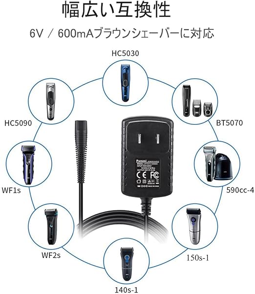 Braunシェーバー用の6V 0.6A電源コード Punasi ブラウン髭剃りに対応できるACアダプター DCアダプター ブラウン バリカン充電コード 充電器 HC5030 530s-4 570s-4 590cc-4 WF2s Water Flex など対応 シェーバー 電源 アダプター braun series 5 5030s ブラウン 充電コード Braunシェーバー充電器