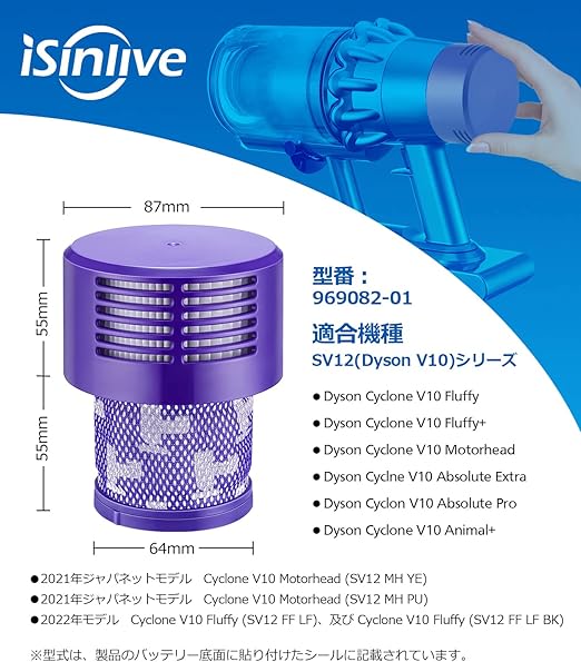 ダイソン 掃除機 V10 SV12 シリーズ用 フィルター 掃除機フィルター 969082-01 Dyson 軽量 Cyclone V10 Fluffy SV12 FF LF コードレス掃除機 互換フィルター 交換品 Cyclone V10 Motorhead (SV12 MH YE)、 Cyclone V10 Motorhead (SV12 MH PU) Cyclone V10 Fluffy (SV12 FF LF BK) 用掃除機フィルター 3個入り 洗濯可能 3個入り アメリカ版