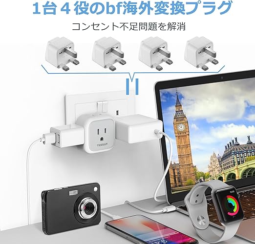 【高い互換性のイギリス用電源変換プラグ】差込口は3つのAタイプ(2ピン)と1つのAタイプ(3ピン)からなって、カメラ、スマホ、ビデオカメラ、ポータプルゲームコンソ