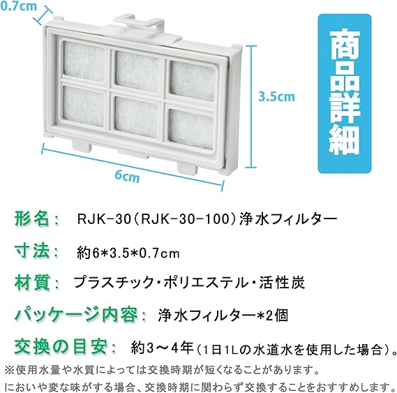 【浄水フィルター・2個セット】形名:RJK-30( RJK-30-100 ) 浄水フィルター 。材質:プラスチック・ポリエステル・活性炭。機能:水道水をろ過して水中に含まれる不純物を除去することができます。