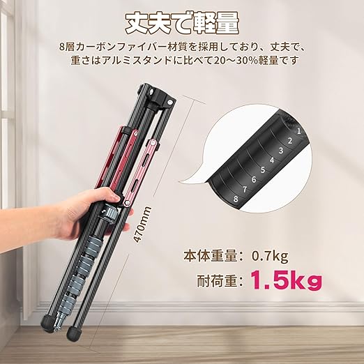 【より軽量で安定性UP】Ulanzi MT-49 ライトスタンドは普通のアルミ製脚スタンドと異なり、耐久性に優れた8層カーボンファイバー素材で作られ、脚直径が28mm、もっと丈夫で軽量です。三脚部に二重アルミ合金部品強化設計を加えたので、安定性が更に良くなります。また、足は滑り止めのゴムが付いて、床を傷つけることなく、地面をしっかりとグリップします。