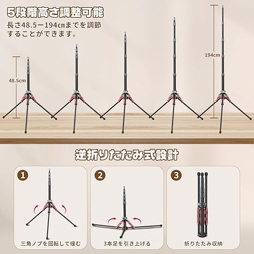 【5段調整可能・一脚に変換】ライトスタンドがは高さが5段調整可能で、最大194cmまでです。脚の開脚角度も調節でき、様々な撮影ニーズを実現します。