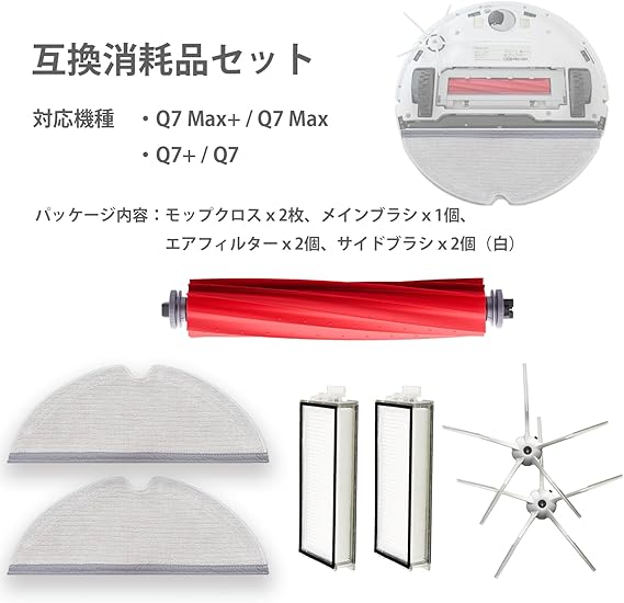ロボロック roborock Q7 Max+ / Q7 Max / Q7+ / Q7 対応 消耗品セット 互換アクセサリー 定期交換部品 モップクロス メインブラシ エアフィルター サイドブラシ (白)
