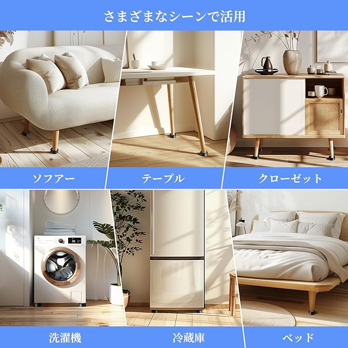 【高さ調節可能で多様な家具に対応】洗濯機、冷蔵庫、ベッドなどの家具に適応し、自由に高さを調節できます。異なる家具や収納スペースに合わせて最適な位置に調整でき、家具の安定性を向上させます。