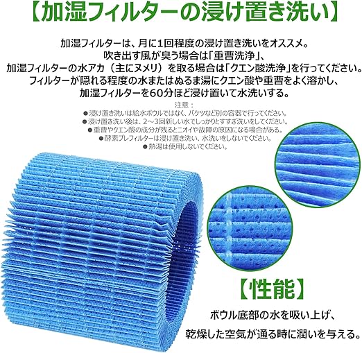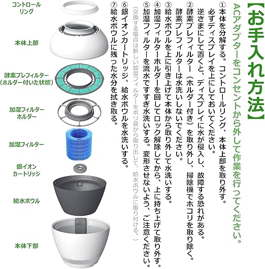 【お手入れ目安】約2週間。フィルタークリーニングサインは約2週間の使用で表示される。表示された場合は、必ずお手入れを行ってください。お手入れをせずに使用を続けると、水アカが付着し固まって取れにくくなり、カビや雑菌が繁殖する。悪臭の発生や、加湿量の低下などの原因になるので、定期的にお手入れを行ってください。