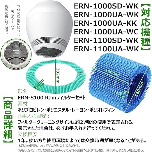 BBT ERN-S100 互換 rain 交換フィルターセット ERN-1100SD 加湿器 空気清浄機 気化式 レイン ERN-1100UA ERN-1000UA ERN-1000SD 加湿フィルター 酵素フィルター 1セット入り