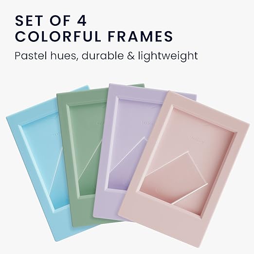 カラフルな4個セット: この写真フレームで、チェキやメモをスタイリッシュに飾れます。寸法は9.2 x 6.1 x 0.7cmで、チェキフィルムを簡単に挿入できます。軽量で丈夫なABS素材を使用しており、耐久性にも優れています。
