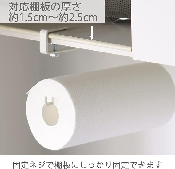【カラー】ホワイト【取付簡単】工具不要。吊戸棚の底板(厚さ1.5~2.5cm)に挟み込み、ねじで留めるだけの簡単仕様。