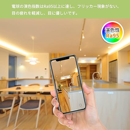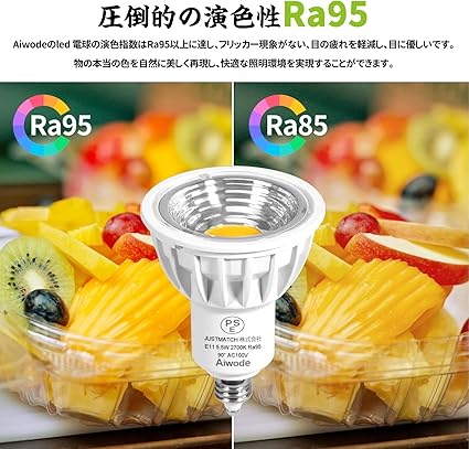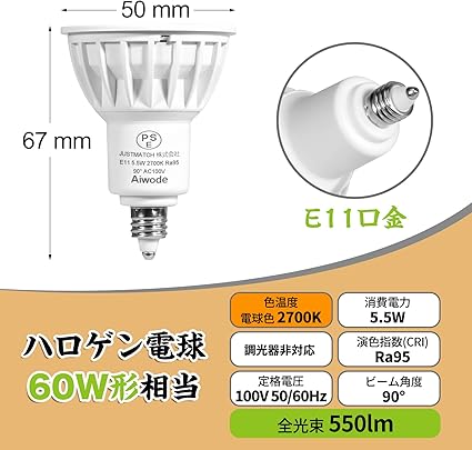 1、演色指数(CRI):95Ra、消費電力:5.5W、全光束:550lm、ビーム角度:90°、色温度:2700K電球色、口金:E11、包装:5個入り.
