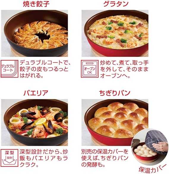 サイズ(約):フライパン26cm/27.5×27.5×6.5cm、フライパン28cm/29.5×29.5×6.5cm、専用取っ手/19×4×4.5cm、専用フタ/31×31×2cm、保温カバー/35×35×10cm、木製プレート/24×24×1.5cm
