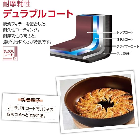 素材・材質1:【フライパン】本体/アルミニウム合金、はり底/ステンレス鋼 (クローム13%)、表面加工/(内面)ふっ素樹脂塗膜加工・(外面 底面を除く)焼付け塗装