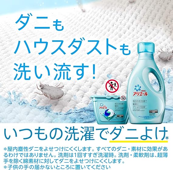 アリエールとレノアの洗浄力、消臭力、防臭力はそのまま、いつもの洗濯でダニよけ※までできてしまいます。 ※屋内塵性ダニをよせつけにくくします。すべてのダニ・素材に効果があるわけではありません。洗