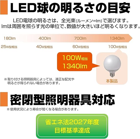 【ご注意】電球をお買い求めの際には口金、種類、調光器・密閉系器具対応可否をご確認下さい。設置個所、照明器具によってはご使用できない場合があります。