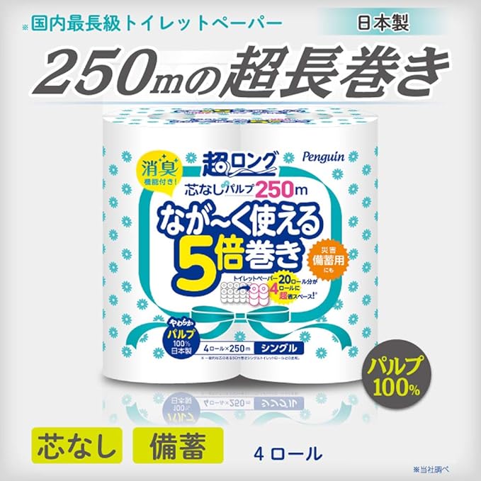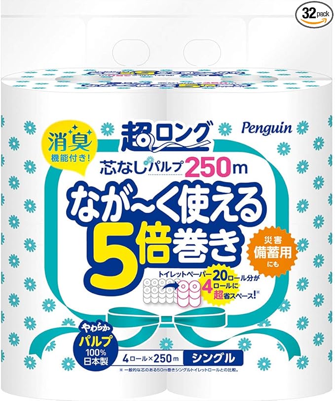 【ケース販売】トイレットペーパー ペンギン 芯なし 超ロング 5倍巻き シングル 250mパルプ 4ロール×8パック 丸富製紙 2795