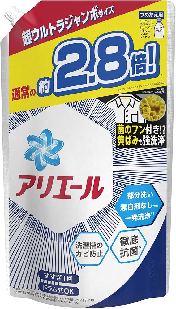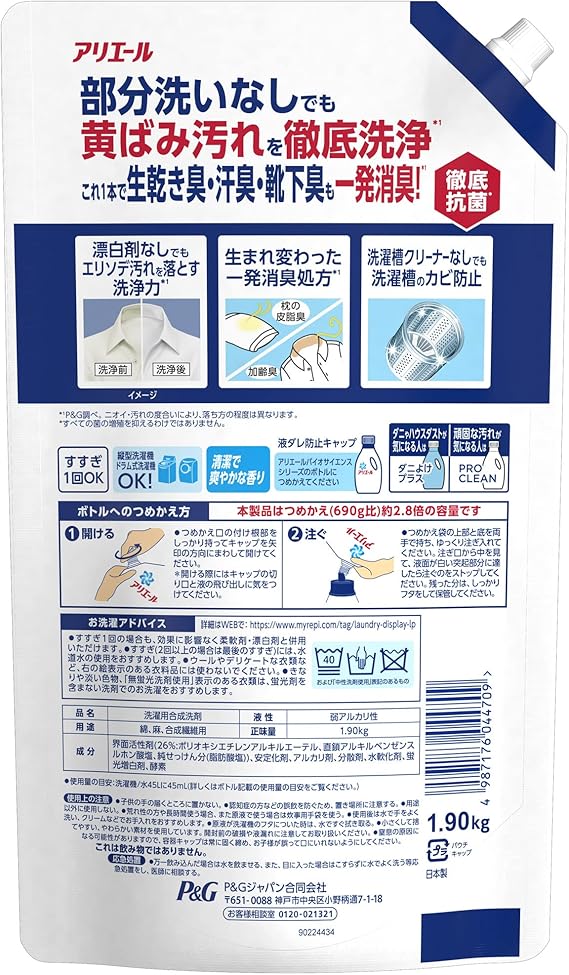 アリエール バイオサイエンス 洗濯洗剤 液体 抗菌&菌のエサまで除去 詰め替え 約2.8倍(1900g) 1 袋