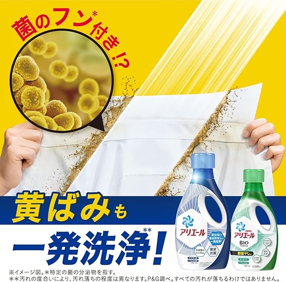 科学と自然の力で大改良アリエールバイオサイエンス。科学の洗浄力と自然の分解力で洗浄力の限界突破*。落ちにくいえりソデ汚れもしっかり落とします。*P&G従来品比較