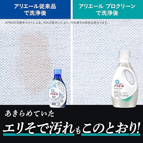 新登場! アリエールプロクリーン エリそで汚れに洗濯機投入の漂白剤を超えた洗浄力 *1 (*1皮脂汚れでの試験。2020年6月時点の市場No.1液体洗濯用洗剤とNo.1酵素系液体漂白剤の併用での比較(P&G調べ)。汚れの度合いにより、汚れ落ちの程度は異なります。 )