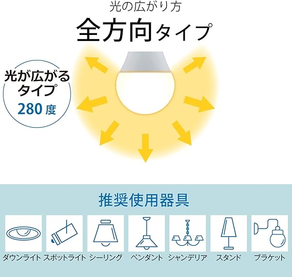 【 特 長 】● 全光束590ルーメン、白熱電球40形相当の明るさ● 光の広がり約280°の全方向タイプ● 密閉形器具対応● 省エネ法2027年度目標基準達成● 昼白色● 口金はE26● LED5年保証対象商品● 2個入り