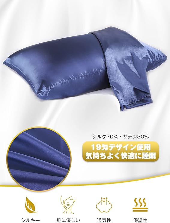 【シルキー枕カバー】ツルツルした肌触りが気持ちよく、縫製もしっかりしています。独特の艶やかな光沢感があり生地は厚めで柔らかです。髪にも肌の敏感なアレルギー体質にも良くアトピーの方にも適されるとのことなので健康的な素材です。