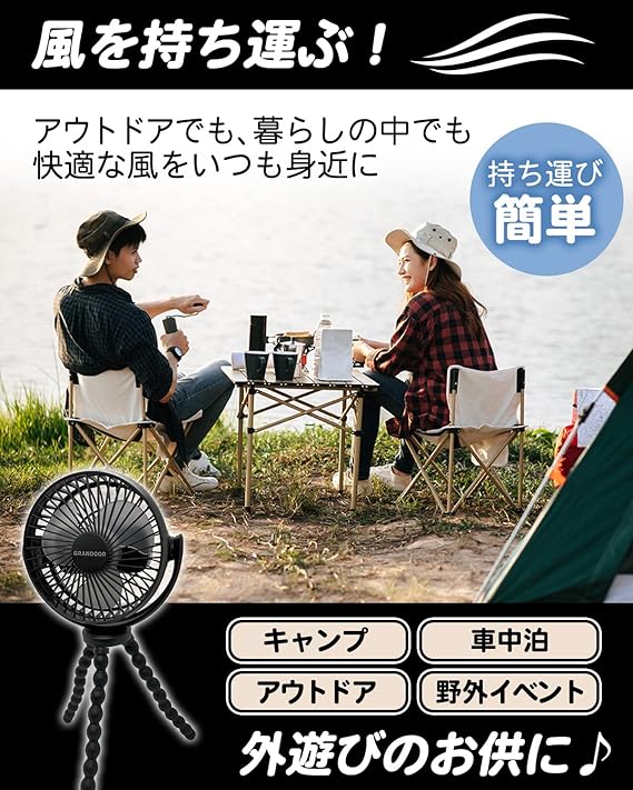 GRANDOOR アウトドア キャンプ用 モバイル扇風機 サーキュレータ? 自在取付アーム usb扇風機 キャンプ 卓上扇風機 充電式 ミニ扇風機 ポータブル 黒