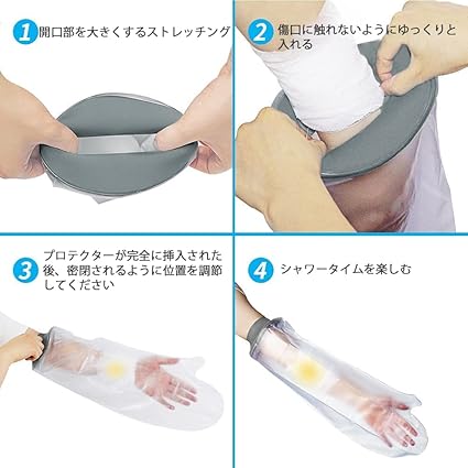 [製品について]本製品は、主にケガで腕にギブスや包帯を巻いているときに、水に濡らさずにシャワーを浴びるために使用するギプス 防水カバーです。