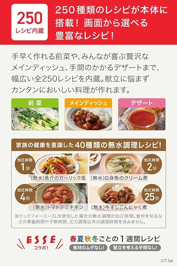 内蔵レシピ250種類(うち無水調理レシピ40種類)