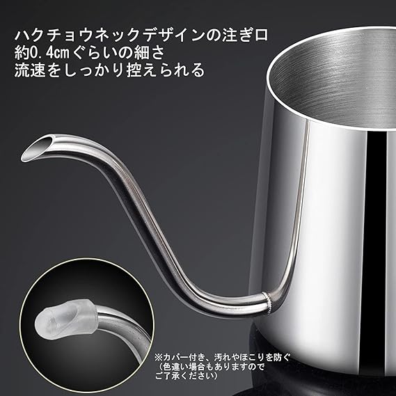【独自のS字形状の注ぎ口】:従来のドリップポットに改良を重ね、独自の注ぎ口形状を開発。お湯が垂直に静かに注げるようになりました。ねらったところに注げて湯量調節がしやすい。