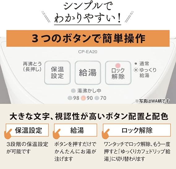 3段階の保温設定が可能。ミルク作りに便利な「70℃保温」も。