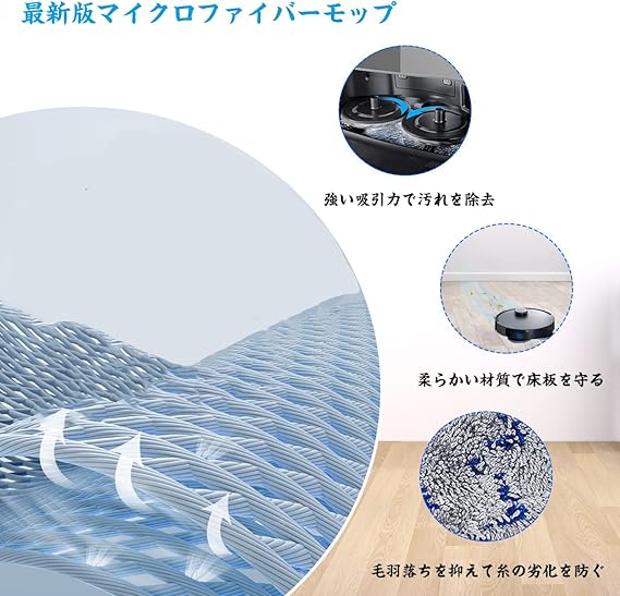 高品質--純正品と同じ生地を使用した厚手マイクロファイバーモップは吸水性に優れているため、床の油汚れ、ほこり、角や角の髪の毛など簡単に掃除出来ており、目に見えない花粉、PM2.5でもしっかりと吸収します。
