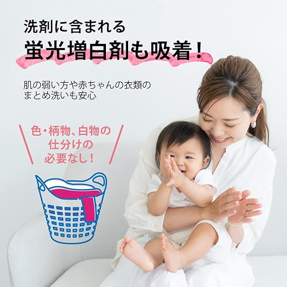 【 他の洗濯物への色移り・くすみを防止 】 衣類から染み出た色素や汚れを特殊加工のシートが吸着して閉じ込めます。他の洗濯物への色移りを抑えられます。