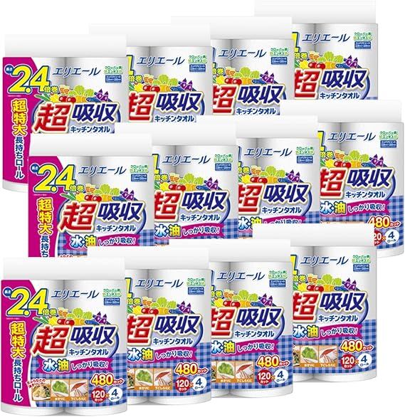 エリエール キッチンペーパー 超吸収 キッチンタオル 120カット×48ロール(4ロール×12パック)2.4倍巻き 【ケース販売】