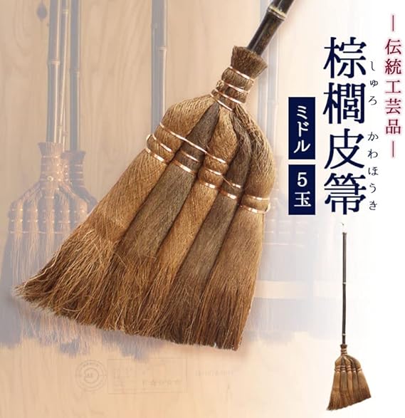 棕櫚箒は数百年の歴史があるといわれる日本の伝統的な箒です。 棕櫚の木から剥いた棕櫚皮をそのまま丸めて束ねて、箒の穂先になるところだけをほぐした棕櫚箒は江戸時代以前から京都を中心に西日本で作られていた和帚です。