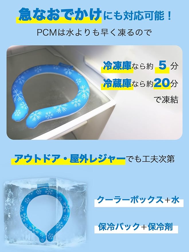暑い真夏の季節でもクールリングはひんやりキープ!28度または24度以下の空間で凍る不思議な氷「PCM素材」で作られた首元用のネッククーラーであるクールリングは、心地良い温度で首の頸動脈を効率