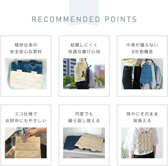 暑い季節の蒸れをすっきり涼しく。リュックに付けるだけで簡単に暑さ対策ができます。お子さまから大人まで、あらゆるリュックに対応!新素材のPCMを使用し28℃以下で自然凍結。またリュックだけでなく、ベビーカー、抱っこ紐の間、ベッドベッド、車の座席の上、氷枕、捻挫や打撲などにもご利用いただけます。PCM素材で熱中症対策グッズでありリュック用冷感パッド、背中用冷却パッド、リュック用クールパッド、冷却バックパックとも呼ばれています。