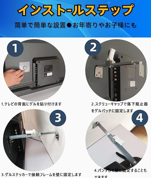 1,【テレビ転倒防止ポール】 固定式耐震転倒防止ポールでテレビを壁に固定することで、地震時のテレビの転倒を防止し、転倒によるケガを防ぎます。また、転倒による故障や買い替え費用も防ぐことができます。 お子様のいるご家庭では、お子様の不注意によるテレビの転倒も防ぎます。
