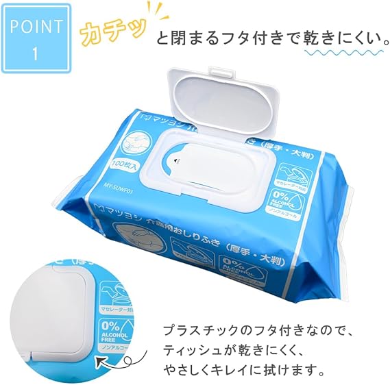 プラスチックの蓋つきなので、ティッシュが乾きにくく、やさしくキレイに拭けます。