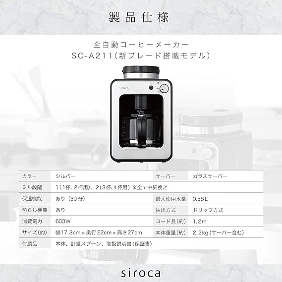 シロカ 全自動コーヒーメーカー アイスコーヒー対応 静音 コンパクト ミル2段階 豆/粉両対応 蒸らし ガラスサーバー SC-A211 ステンレスシルバー…
