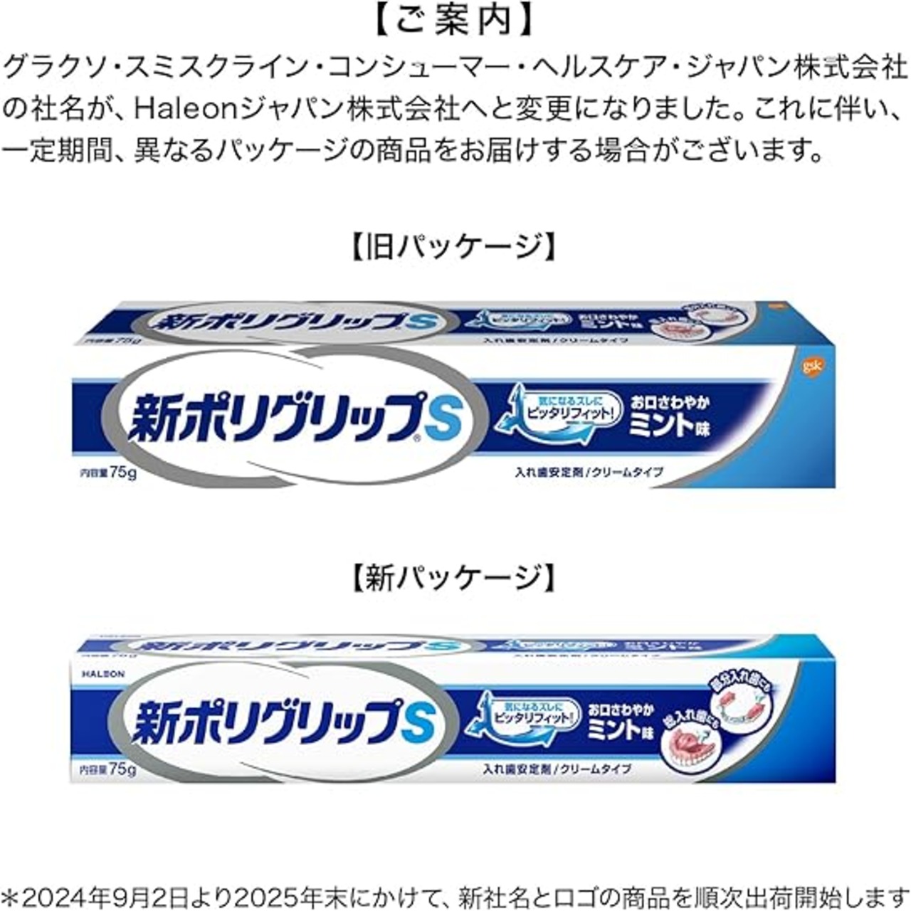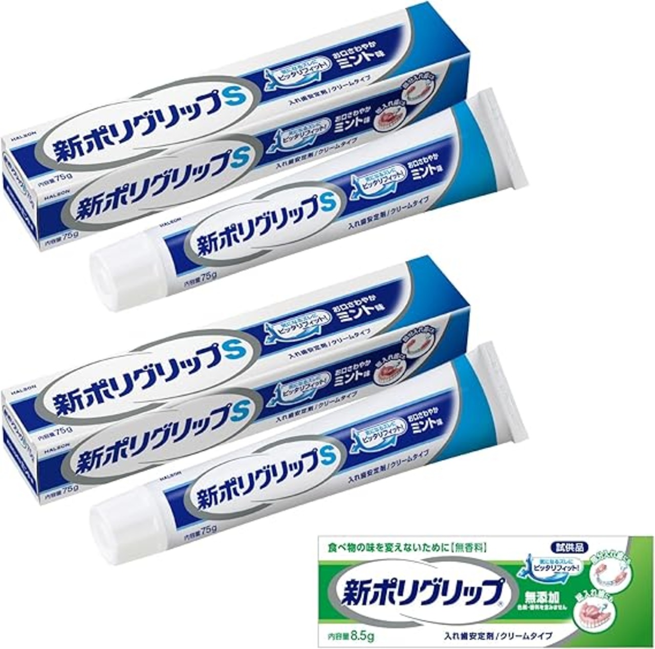 【Amazon.co.jp 限定】新ポリグリップ S 部分・総入れ歯安定剤 (お口さわやかミント味) 75g 2本 + 新ポリグリップ無添加8.5g(非売品)付き