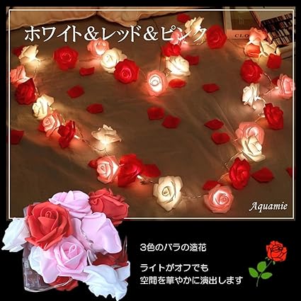 バラの花のライト飾り装飾、お洒落で可愛いLEDイルミネーションライト。結婚式、誕生日などのホームパーティー、イベントなどの飾り付け、クリスマスの飾りなどにお使い頂けます。
