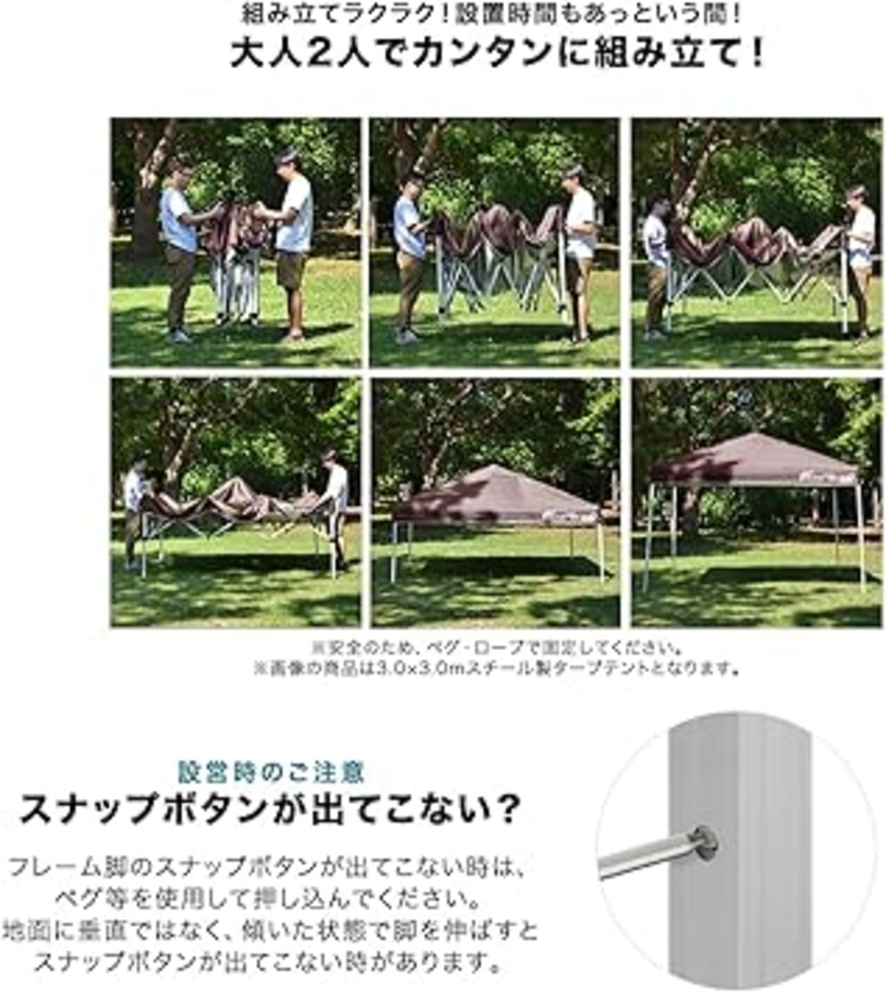 【組み立て簡単!ベンチレーション付き】 2.5×2.5mサイズのアルミ製タープテントです。 組み立ては広げて立ち上げるだけなので簡単。 アウトドアやイベント時の日よけに最適です。 ベンチレーション付きで機能面にも優れています。