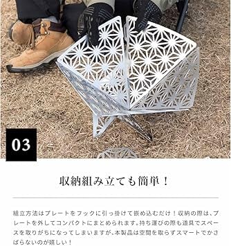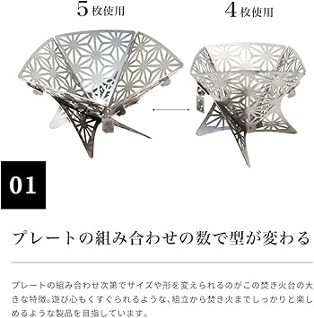 【コンパクトで変幻自在、組み合わせで何度も楽しめる和柄焚き火台】 プレートの組み合わせで型が変えられる伝統的な麻柄を用いたデザインの焚き火台です。組み立てから収納までコンパクトで、より焚き火を楽しめるようにデザインしています。ソロキャンプからグループキャンプまで、幅広いシーンでお使い頂けます。