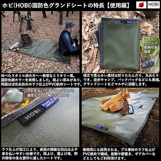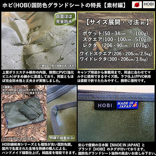 HOBI 国防色グランドシート ワイドスクエア206×206cm【日本製】ソロ 上質ラフ仕上げPVC帆布 両面防水加工 [無骨でタフ] 軽量 厚手 マルチ テントシート キャンプ 釣り タープ アウトドア 車 業務 荷台 レジャー マット カーキ オリーブ 軍幕 [MADE IN JAPAN]