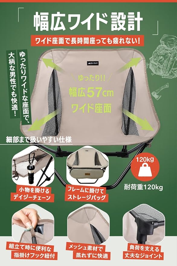 ◆【ワイド座面】一般的なコンパクトチェアは横幅が狭く窮屈に感じます。RiveRockのチェアは横幅57cmで大柄な男性でもゆったりご使用いただけます。◆【ローチェア】焚き火や調理など長時間座っても疲れない最適な高さの設計であぐらチェアとしてご使用いただけます。