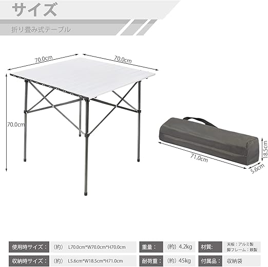 TIMBER RIDGE アウトドアテーブル 折りたたみ 70*70*70cm テレワーク 重量4.2kg 耐荷重45kg アルミ ロールテーブル キャンプ bbq 収納袋付き コンパクト 自宅勤務
