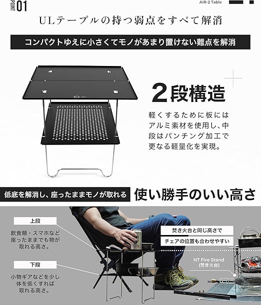 重さ半分、広さ2倍をコンセプトに作られた超軽量 X2段テーブル 「Air-2 Table」 これぞ軽量テーブルの完成形。ちょっとしたアウトドアやソロキャンプにおすすめです。