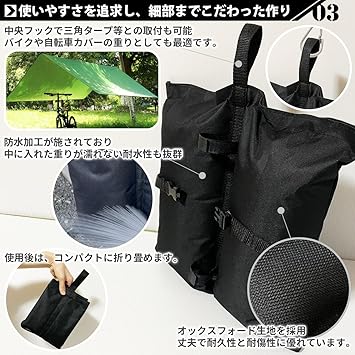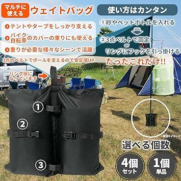 【マルチに活躍「ウェイトバッグ 4個セットor1個単品」】 テントの固定に重宝する「ウェイトバッグ」は、中に砂やペットボトルなどの重りを入れ、3箇所のベルトでポールを固定、もしくは中央のループ(画像内の矢印の部分)にフックを引っ掛けるだけで簡単にご使用いただけます。タープの固定、バイク・自転車カバーの重り、物干しの重りなど、幅広い用途で大活躍です。