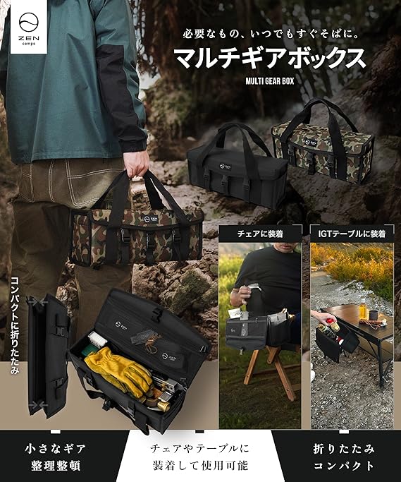 ZEN Camps 折り畳みマルチギアボックス、ソフトコンテナ、ソフト収納ボックスです。大容量、畳めばコンパクト。 ブラックとカモフラージュの2色展開。