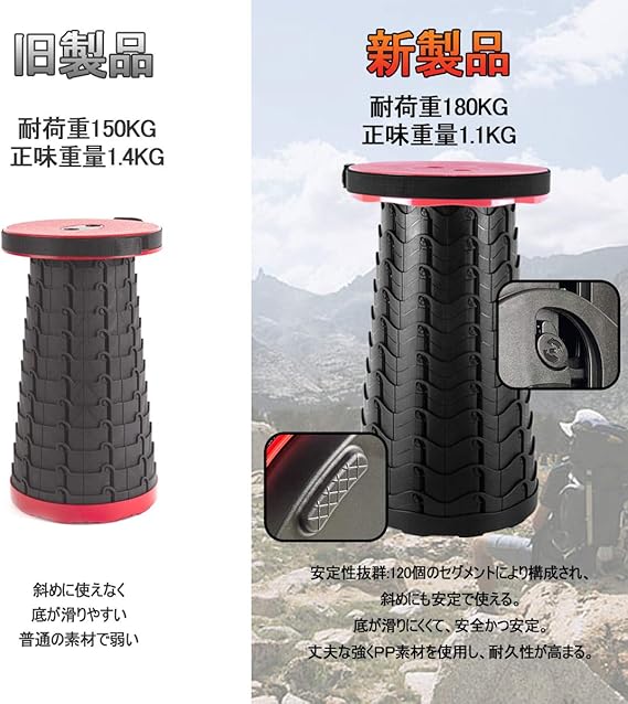 【最新の改良版、耐荷重180KG】最新型で、本体重量は僅か1.15KGなのに、耐荷重はなんと180KGまで対応、改善後にリクライニング可能(旧式は傾斜してはいけない)。PA6+PPプラスチック素材採用、丈夫で安定感も抜群
