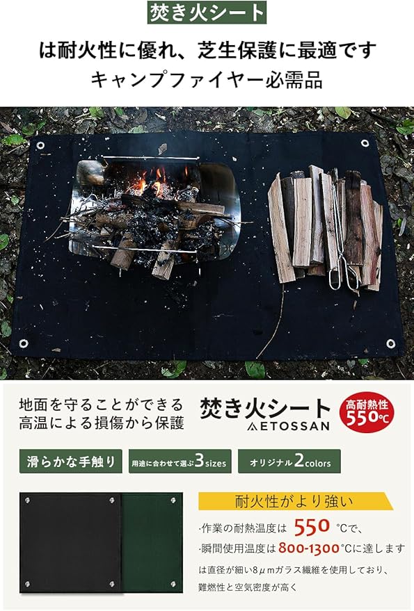 【より耐火性】耐熱シートには直径がより細い8μmのガラス繊維が使用され、耐熱温度は550℃に達し、通常の焚き火シートよりも難燃性や空気密度が高く、